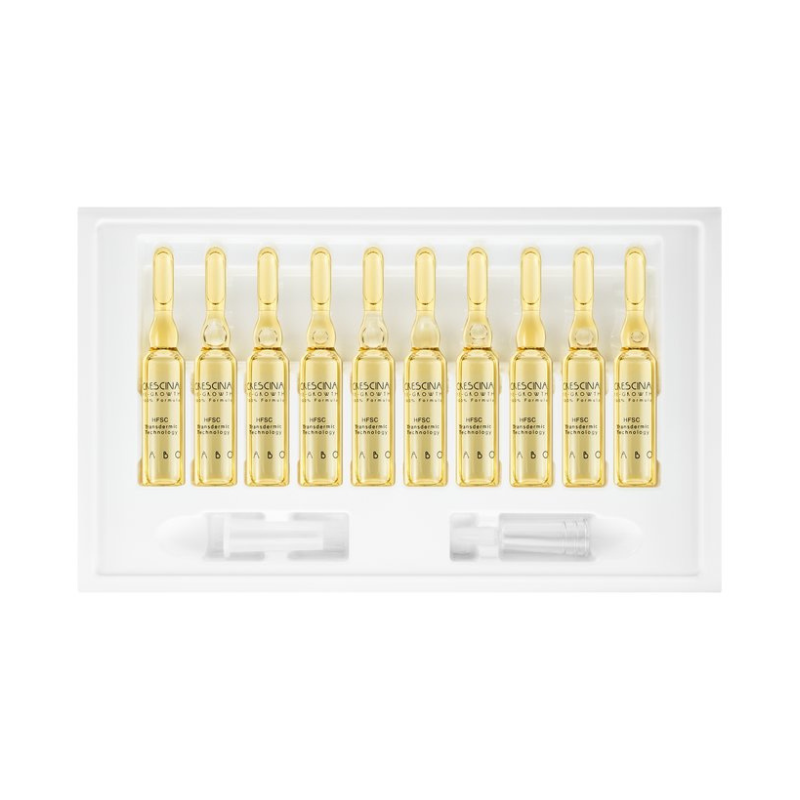 - 10 ampolas Crescina Re-Growth HFSC – com Cisteína, Lisina, Glicoproteína e Stem-Engine, para estimular o bolbo capilar e reativar o crescimento;