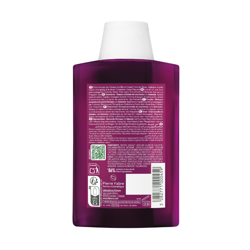 Champô de crescimento Klorane com adenosina e quinina. Acelera o crescimento, fortalece a fibra capilar, redensifica (+74% densidade capilar). Cabelo mais resistente e vital.