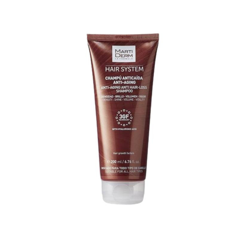 Martiderm Hair System Champô Antiqueda Antiaging 200ml de uso frequente, complementar a tratamentos antiqueda que combate o envelhecimento capilar e melhora a fixação ao couro cabeludo.
