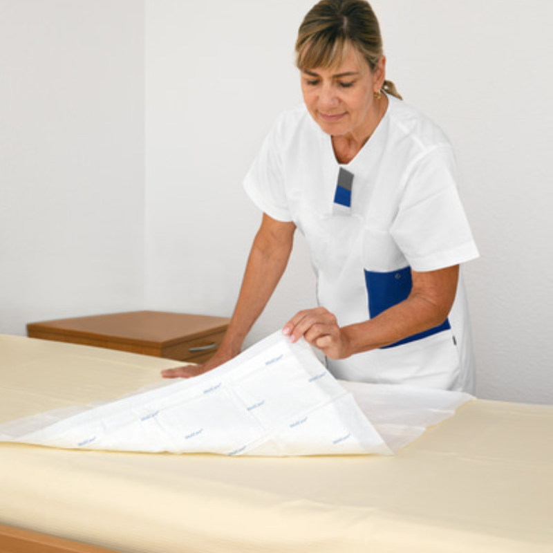 Os resguardos Molicare Bed Mat com parte absorvente interna composta com polpa de celulose, proporcionam higiene e proteção extra com um nível de absorção de 7 Gotas.