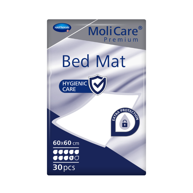 Os resguardos Molicare Bed Mat com parte absorvente interna composta com polpa de celulose, proporcionam higiene e proteção extra com um nível de absorção de 7 Gotas.