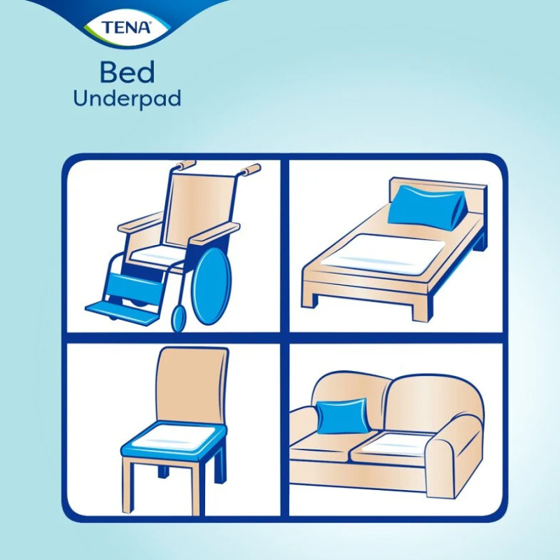 TENA Bed Plus é um resguardo absorvente e impermeável para proteção contra perdas moderadas a graves de urina e apoio em cuidados de higiene.