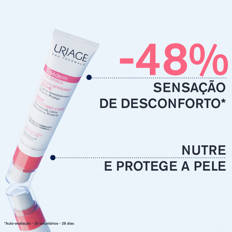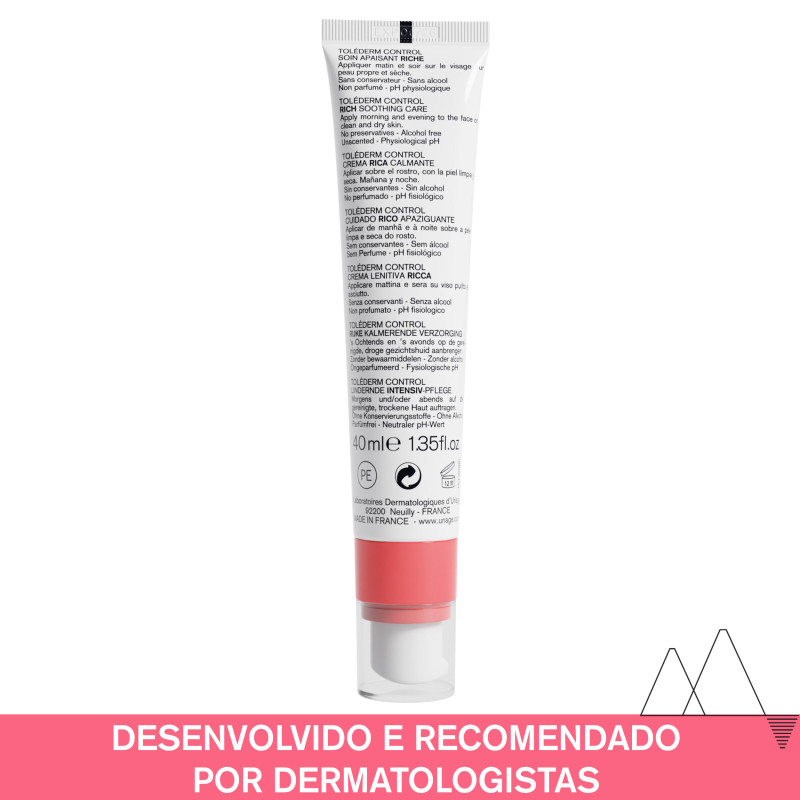 Tolederm Control: hidratante e calmante para pele sensível, intolerante e reativa. Fórmula minimalista com poliuromídeos de algas, esqualano e glicerina. Sem álcool, sem perfume, alta tolerabilidade.