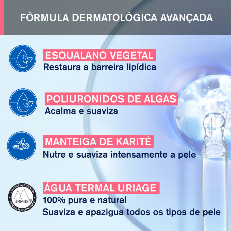 Fórmula minimalista - 3 ingredientes ativos de origem natural: Água Termal de Uriage + Poliuronídeos de Algas + Esqualeno Vegetal. Fórmula composta por 91% de ingredientes de origem natural.