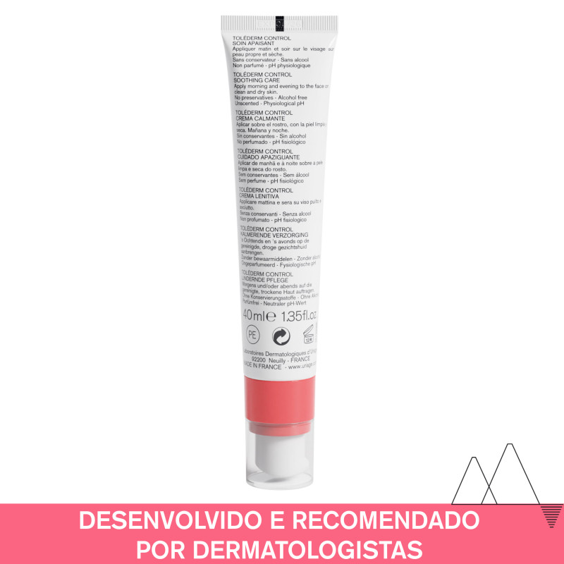 Tolederm Control: hidratante e calmante para pele sensível, intolerante e reativa. Fórmula minimalista com poliuromídeos de algas, esqualano e glicerina. Sem álcool, sem perfume, alta tolerabilidade.