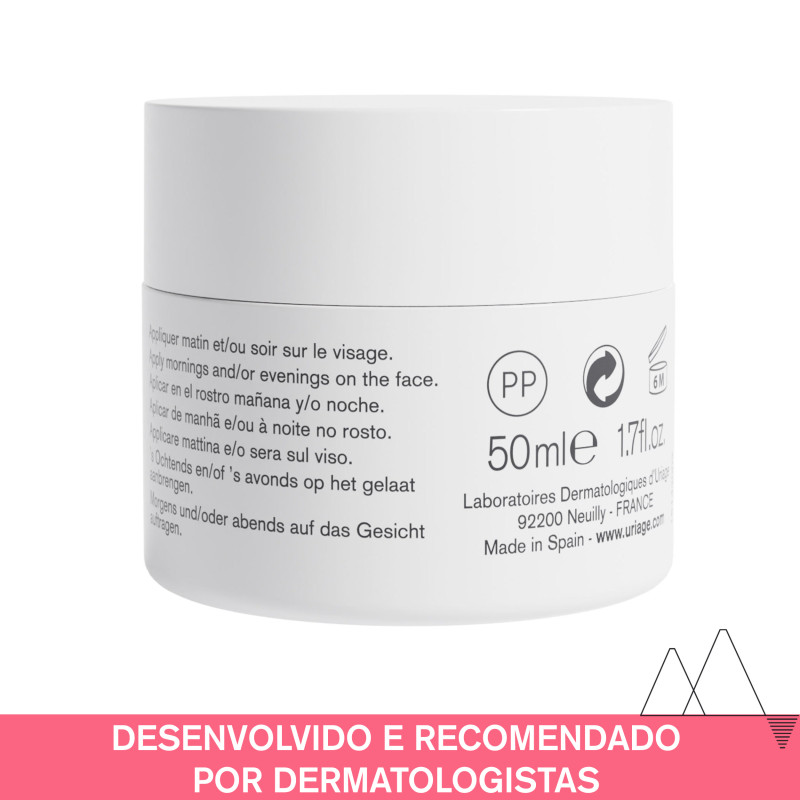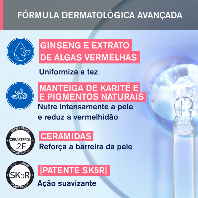 Água Termal de Uriage - Cerasterol-2F - Complexo SK5R - Complexo TLR2-REGUL - Extratos vegetais - Partículas verdes de pérolas - Polideceno - Manteiga de Karité.