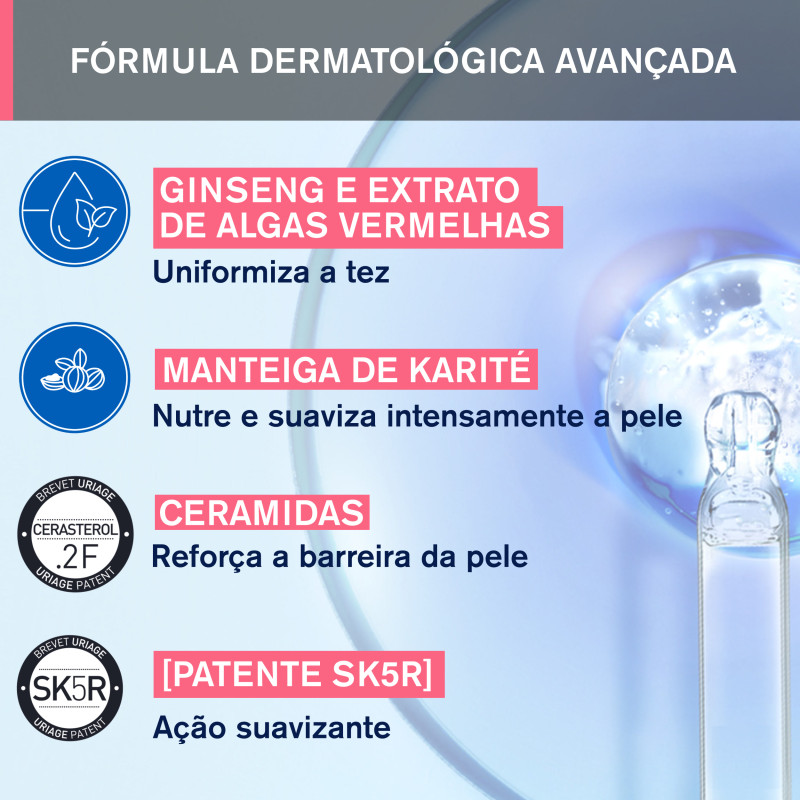 ✔ Graças à sua fórmula rica em Água Termal Uriage, com ação calmante e hidratante, e ao Cerasterol-2F®, que reestrutura e protege a barreira cutânea, a pele sente um conforto imediato.