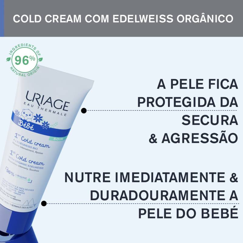 O 1º Cold Cream da Uriage foi especialmente desenvolvido para nutrir, proteger e acalmar a pele seca e sensível dos bebés, mesmo nas condições mais agressivas como frio, vento e água calcária. A sua fórmula, com 97% de ingredientes de origem natural, combina o poder calmante da Água Termal de Uriage com o Edelweiss Biológico dos Alpes, para um cuidado delicado, eficaz e seguro.