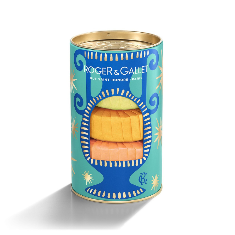 Descobre a coleção especial de Natal da Roger&Gallet com esta lata azul, que reúne três sabonetes bienfaisantes com fragrâncias icónicas. Uma seleção perfeita para transformar a rotina de higiene num momento de puro prazer sensorial.