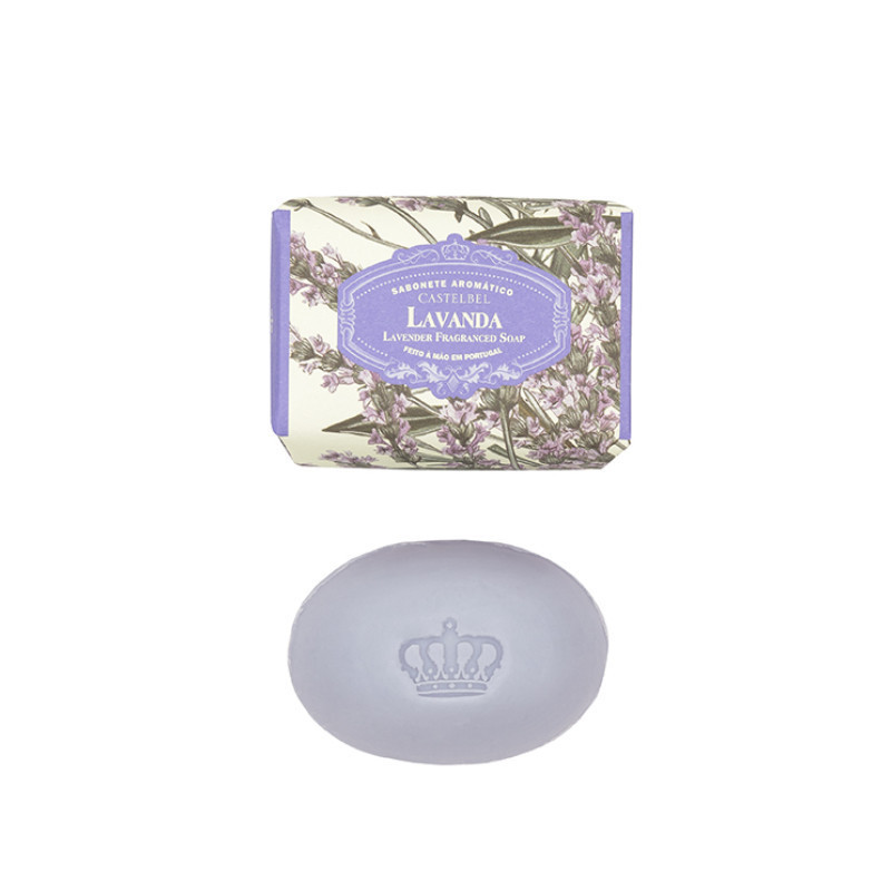 Castelbel Lavanda Sabonete é um sabonete com um perfume relaxante e espuma cremosa. Elaborado com uma base 100% vegetal e embalado à mão por artesãs numa embalagem decorada com ilustrações de flores de lavanda.