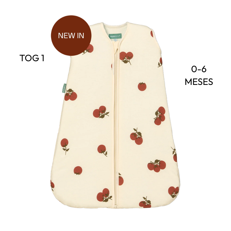 Saco de Dormir MOLIS&CO Tomatoes TOG 1 para bebés 0-6 meses, meia-estação (21-23°C). 100% algodão suave, levemente acolchoado. Substitui mantas com segurança. Ideal para primavera e outono. Feito com algodão sustentável.