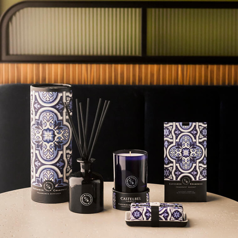 Castelbel Lavanda e Camomila Saqueta Perfumada é uma saqueta aromática fabricada com cortiça portuguesa, o que lhe permite libertar lentamente a fragrância, fazendo-a perdurar por mais tempo. Com uma fita de cetim, é ideal para pendurar no roupeiro, podendo também ser colocado em gavetas e malas ou usado para perfumar o automóvel.