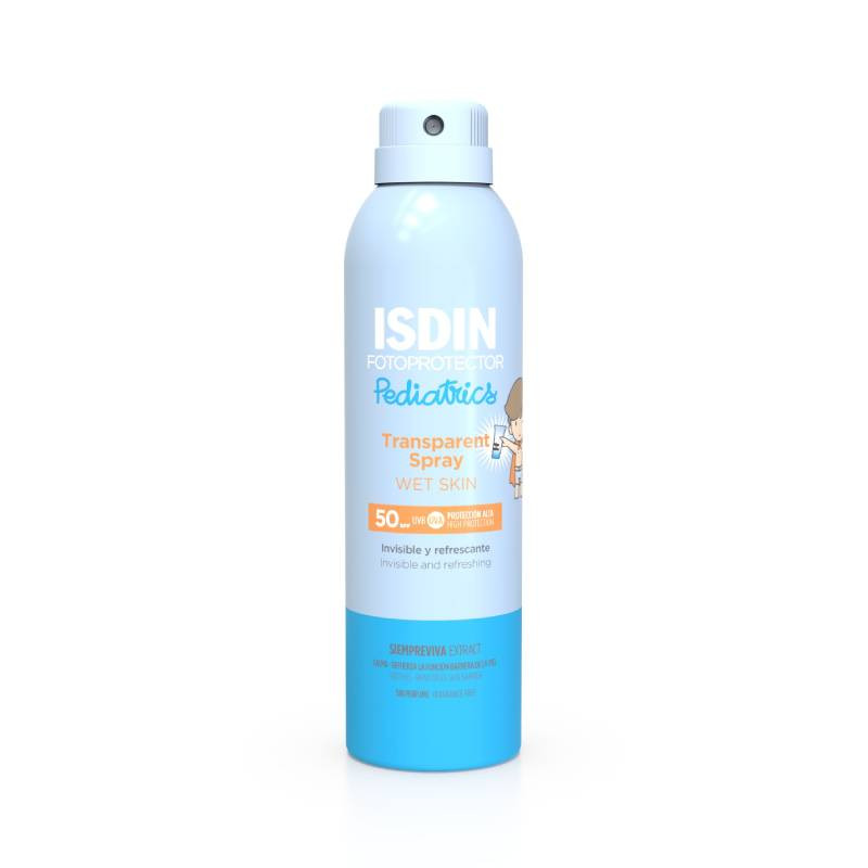 Isdin Fotoprotector Pediatrics Transparent Spray Wet Skin FPS50 é um fotoprotetor corporal em spray transparente, fresco e de absorção imediata, formulado para a pele das crianças a partir dos 3 anos.