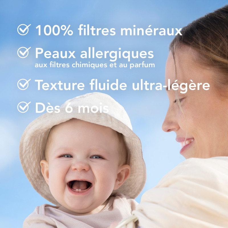 Fotoprotetor Bioderma Mineral FPS50+ com filtros 100% minerais. Alta proteção para peles sensíveis, alérgicas ou intolerantes. Apto para bebés a partir dos 6 meses.