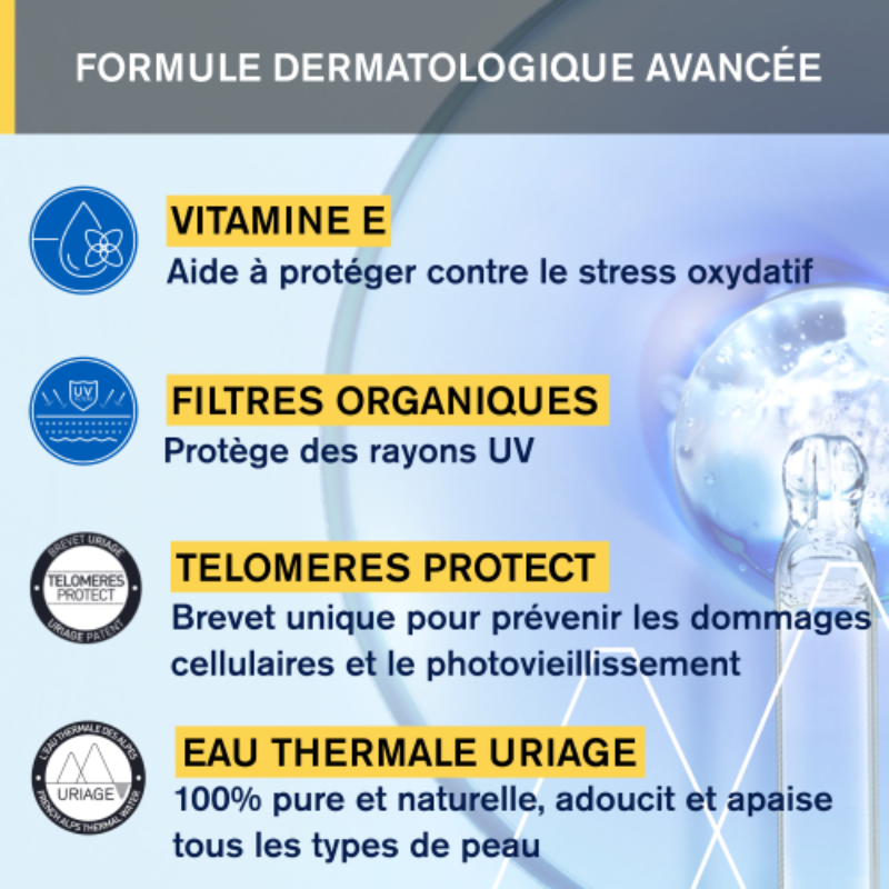 Ingredientes chave: Complexo filtrante UVA-UVB-luz azul — Patente [BARIÉSUN] — Patente [TELOMERES PROJECT] — Água Termal de Uriage — Vitamina E —Aquaspongines.