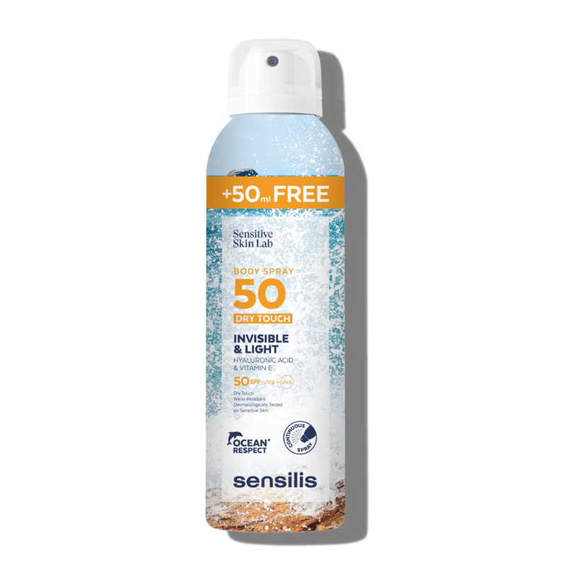 Sensilis Sun Body Spray Toque Seco FPS50 é uma bruma invisível e refrescante de proteção solar elevada, com fórmula de rápida absorção e acabamento seco. Pode ser aplicada sobre pele seca ou molhada, oferecendo conforto imediato e proteção eficaz, ideal para reaplicações práticas ao longo do dia.