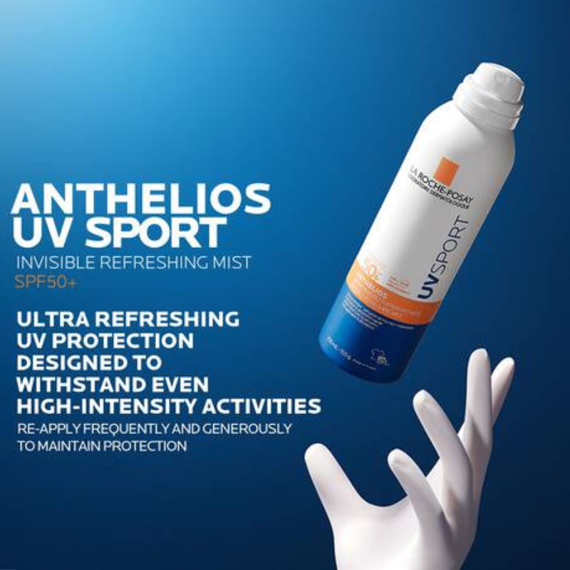 Bruma solar La Roche-Posay Anthelios UV Sport SPF50+ (200ml) para atividades de alta intensidade. Proteção muito alta, resistente à água, areia e suor. Não transfere para a roupa. Textura refrescante, toque seco invisível. Para todos os tipos de pele.