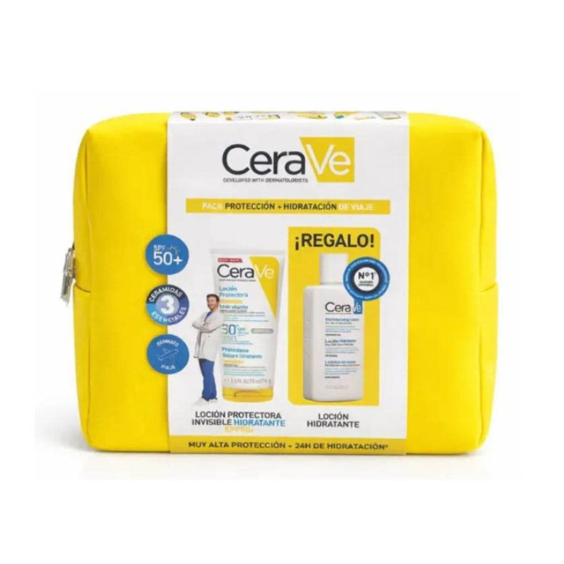 Pack CeraVe com loção protetora invisível hidratante SPF50+ (75ml) e loção hidratante (88ml) + bolsa. Proteção UVA/UVB muito alta, hidratação diária. Com 3 ceramidas. Para rosto, corpo e toda a família.