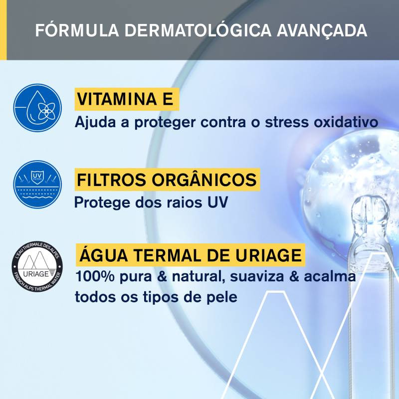 Complexo filtrante UVA-UVB— Patente [BARIÉSUN] — Água Termal de Uriage — Vitamina E — Aquaspongines — Acabamento invisível - Toque seco - Testado sob controlo dermatológico