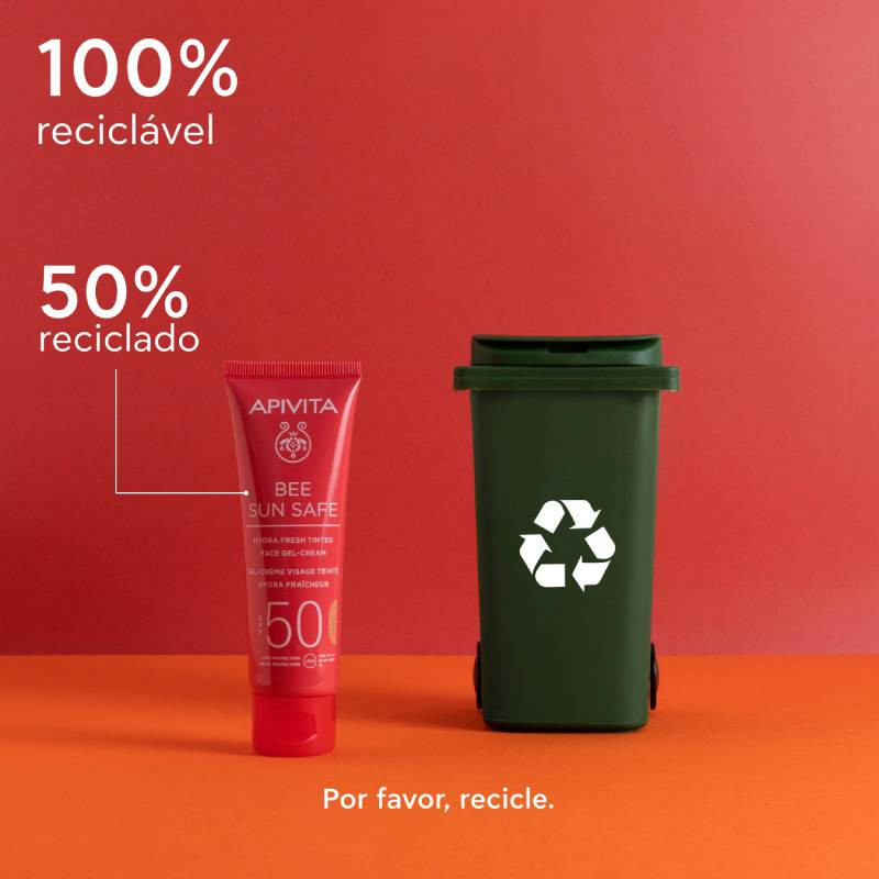Apivita BeeApivita Bee Sun Safe Gel-Creme Hidra Refrescante SPF50 Com Cor 50ml com textura ligeira e proteção de amplo espetro (UVA, UVB, IV e Luz azul), uniformiza a tez e oferece uma tonalidade natural, hidratação e frescura instantânea e duradoura.