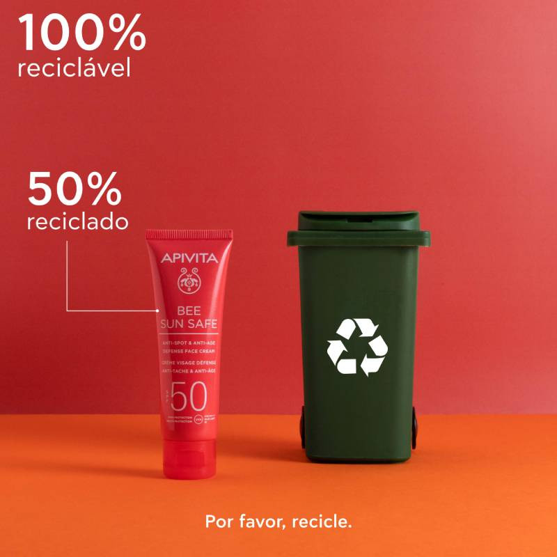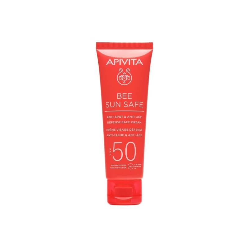 Apivita Bee Sun Safe Anti-Spot e Anti-Age Creme FPS50 50ml é um protetor solar de rosto que previne e reduz a aparência de rugas e manchas escuras.