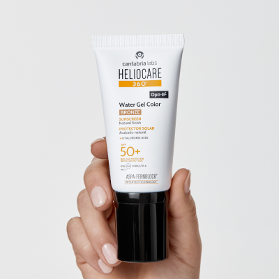Heliocare 360º Color Water Gel Bronze FPS50+ com textura fluida e ultra ligeira, oferece um acabamento suave, uniformiza o tom da pele e disfarça imperfeições.