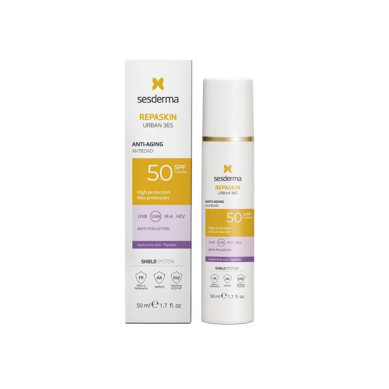 Sesderma Repaskin Urban 365 Anti-aging SPF50 50ml é um protetor solar de uso diário, com textura creme acabamento revitalizante, indicado para os sinais de envelhecimento.