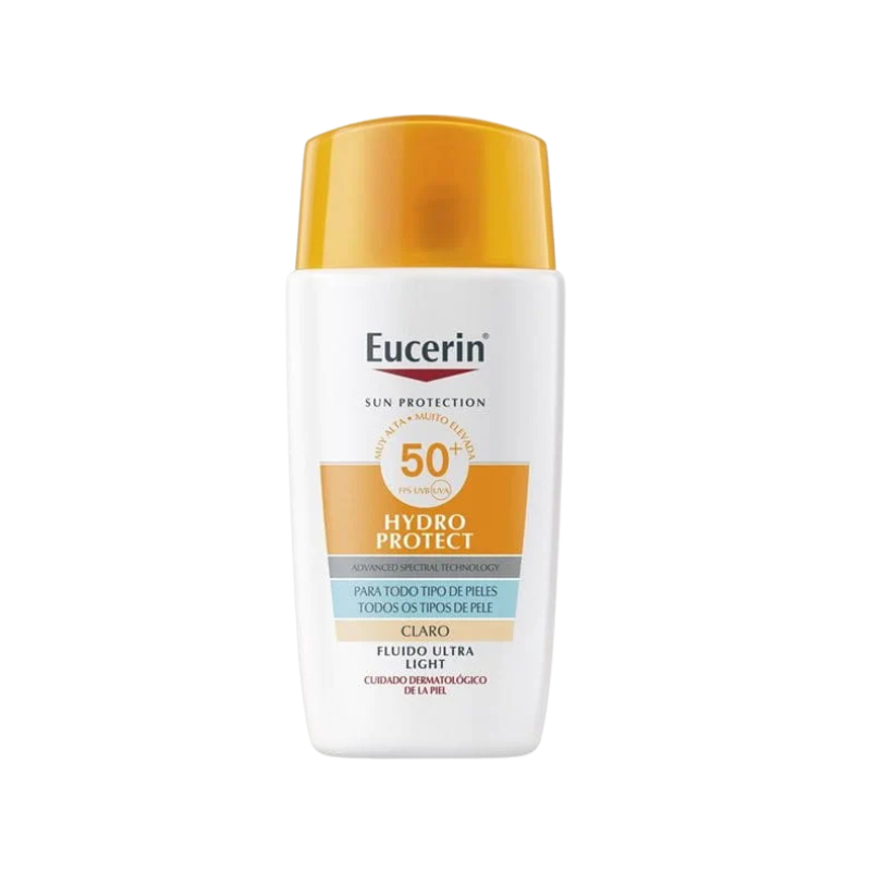 O Protetor Solar Eucerin Sun Hydro Protect Fluid Ultra Light Claro SPF50+ oferece proteção muito alta contra raios UVA, UVB e luz HEVL. Ideal para todos os tipos de pele, incluindo peles sensíveis, proporciona um acabamento natural e uniforme, garantindo conforto durante a exposição solar.