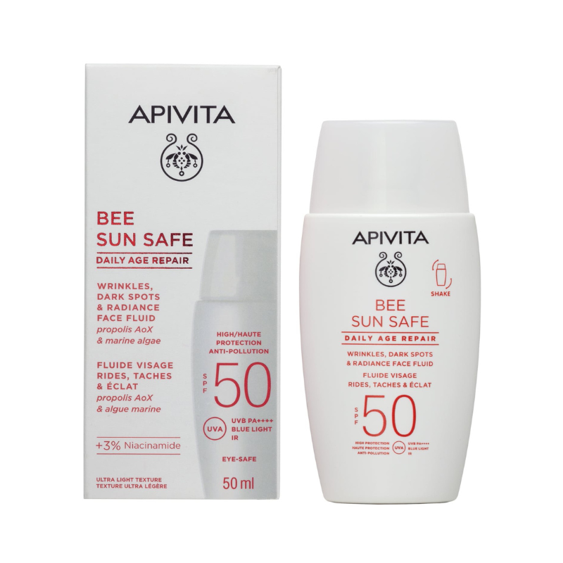 O protetor solar Apivita Bee Sun Fluido Diário Age Repair de textura ultraleve, oferece hidratação, previne o fotoenvelhecimento e protege contra a poluição atmosférica diária.