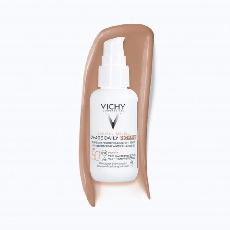 Vichy Capital Soleil UV-Age Daily Pigment Medium SPF50+ é um protetor solar com cor, potenciado com a tecnologia Netlock, oferece uma proteção muito elevada enquanto ajuda a prevenir os sinais de fotoenvelhecimento da pele.