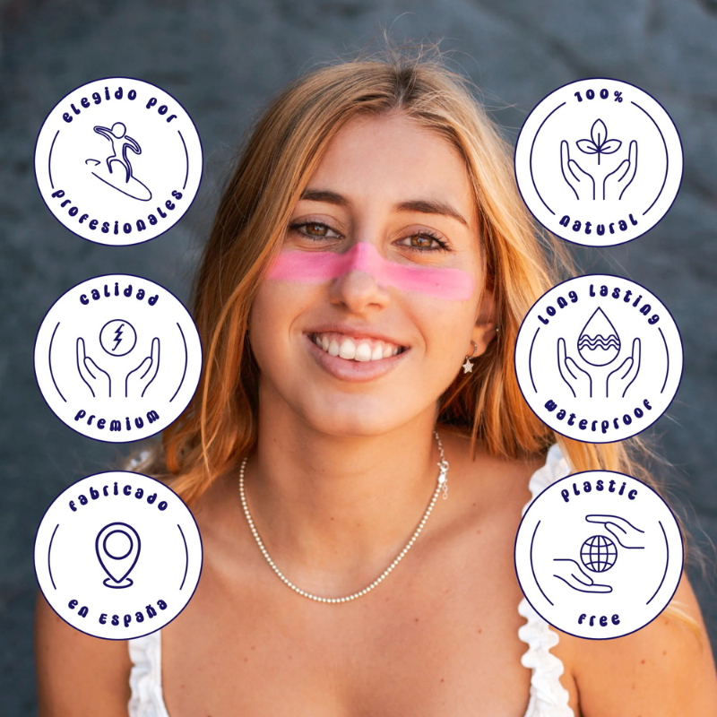 A fórmula é 100% natural, resistente à água e vem numa embalagem sem plástico, ideal para proteger a pele e os oceanos. A cor rosa torna-o fácil de aplicar e excelente para crianças — garante uma cobertura segura, duradoura e visível durante todo o dia.