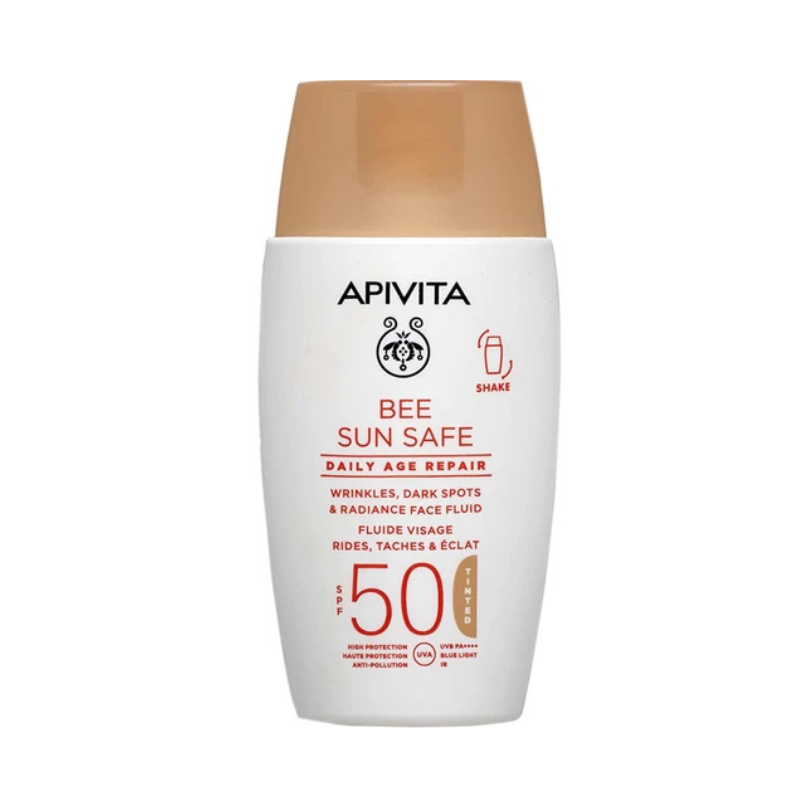 Fluido com cor Apivita Bee Sun Daily Age Repair SPF50 (50ml). Proteção muito alta contra UV, luz azul e poluição. Previne manchas e rugas, com 3% niacinamida. Textura ultraleve, cobertura natural. Ideal como substituto da maquilhagem.