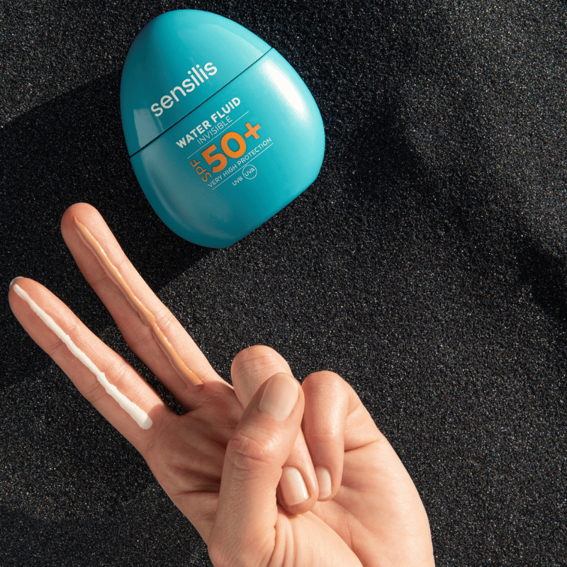 Protetor solar facial Sensilis Water Fluid SPF50+. Textura à base de água, ultraleve, acabamento invisível, mate e sedoso. Hidrata (+20%), melhora elasticidade (+17%), acalma (5 min) e tem ação antioxidante.