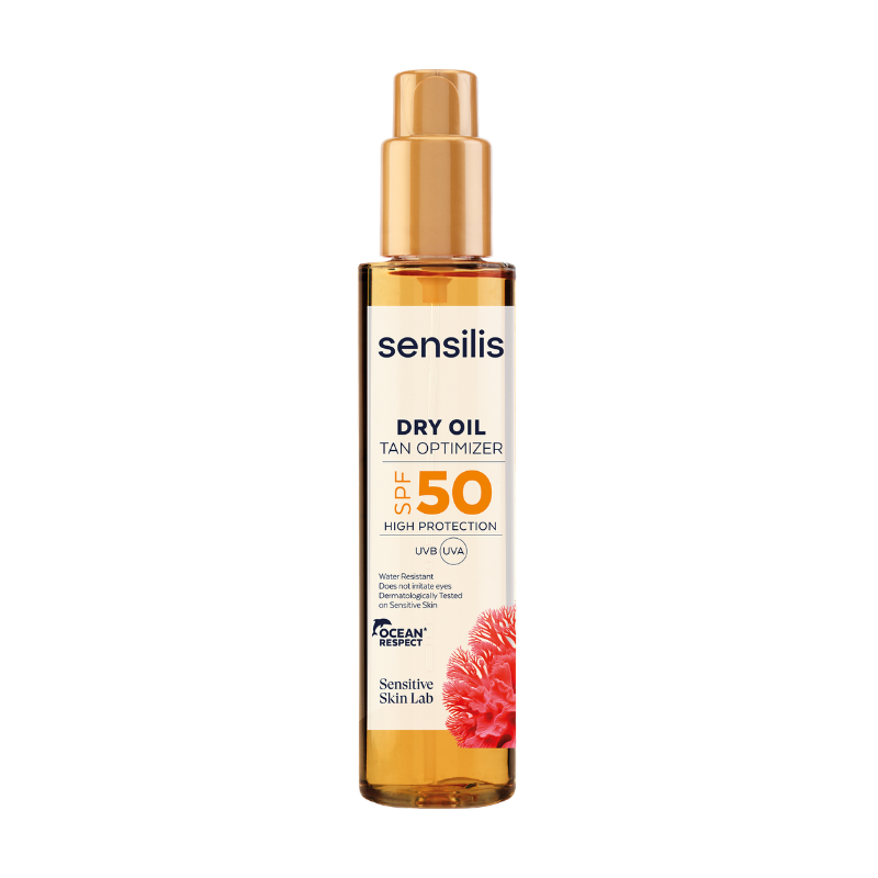 O Dry Oil Tan Optim SPF50 da Sensilis é o óleo seco que faz tudo: protege do sol com fator 50, otimiza o bronzeado de forma progressiva e natural, e ainda cuida da pele com hidratação e ação anti-inflamatória. A textura é leve, absorve num instante, e não deixa a pele oleosa. Perfeito para quem quer brilho – mas não quer brilho a mais.