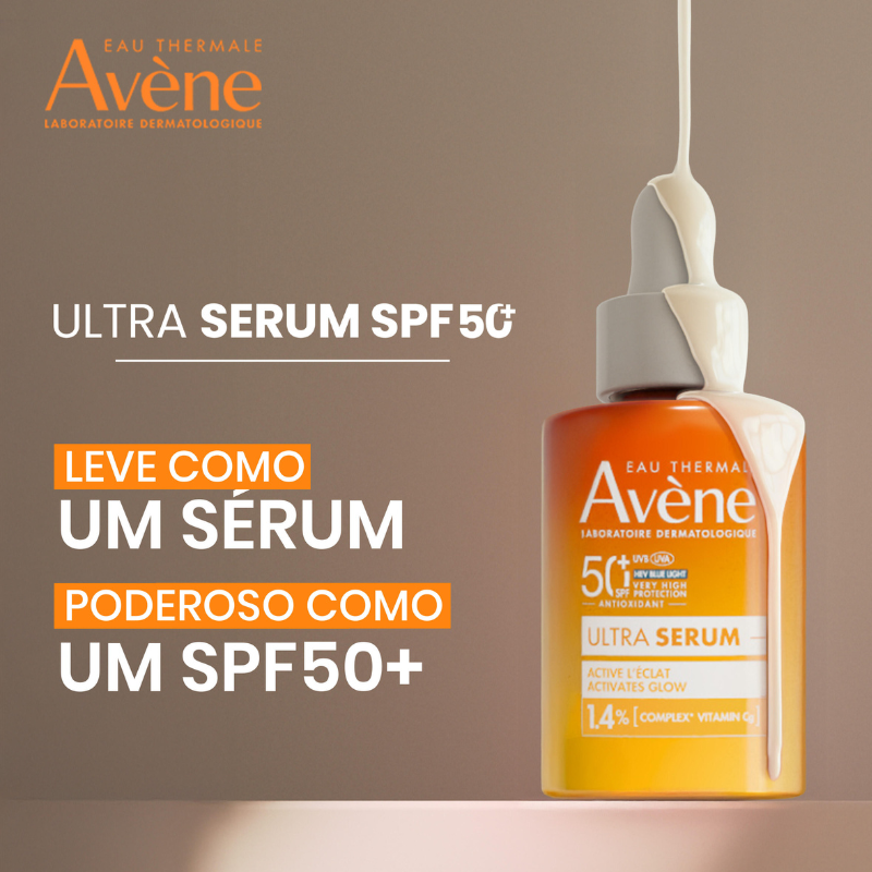 Sérum solar Avène Ultra SPF50+ com efeito iluminador. Protege UVB, UVA e luz azul (Triasorb™). Ilumina instantaneamente com complexo de vitamina C. Textura ultraleve, não oleosa, não pegajosa. Excelente base de maquilhagem.