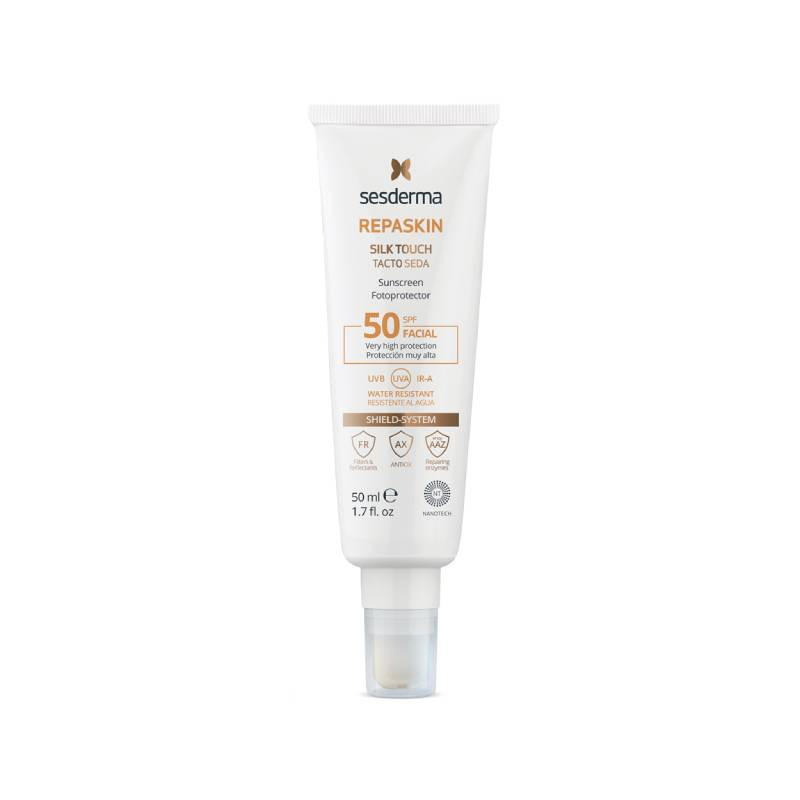 Sesderma Repaskin Facial FPS50 Tacto Seda é um protetor solar de rosto, com efeito toque seda, indicado para todos os tipos de pele.