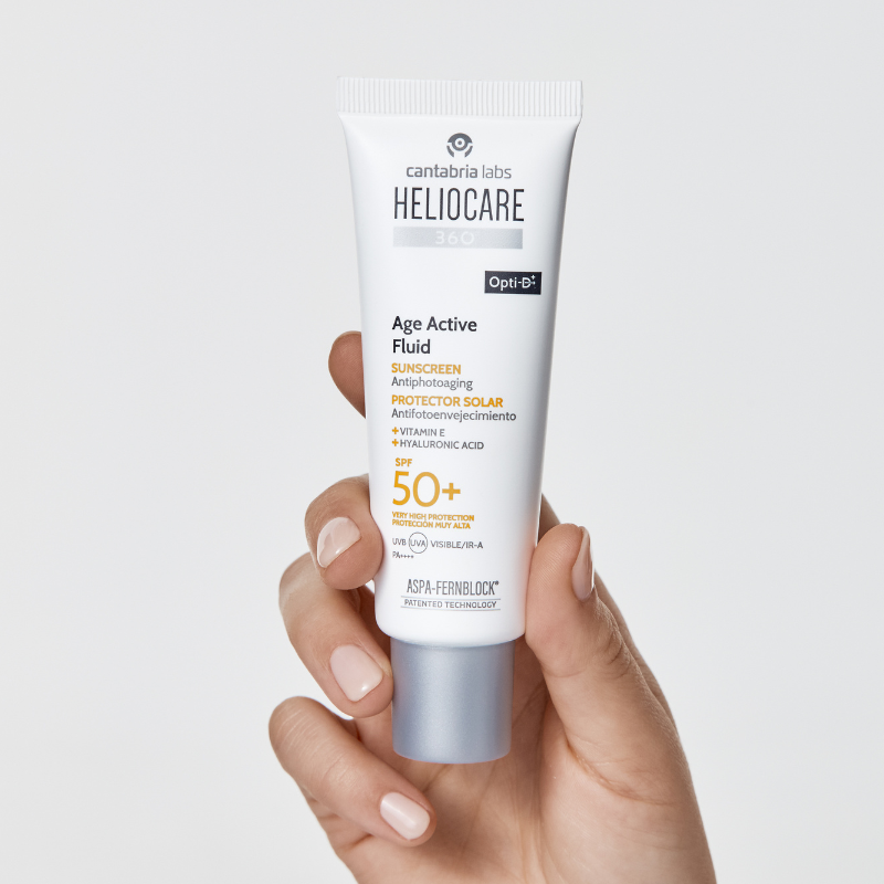 O protetor solar Heliocare 360º Age Active Fluid SPF50 ajuda a prevenir e reparar o envelhecimento cutâneo induzido pelo sol e outros fatores de stress ambiental.