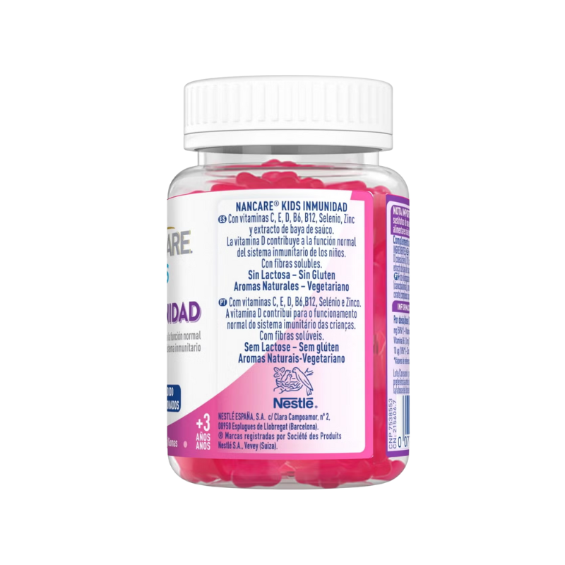 NANCARE KIDS Imunidade são gomas vitamínicas para crianças a partir dos 3 anos. Formuladas com Vitamina C, D, B6, B12, Zinco e Selénio para o normal funcionamento do sistema imunitário. Sem açúcares, sem glúten e com sabor a frutos silvestres.
