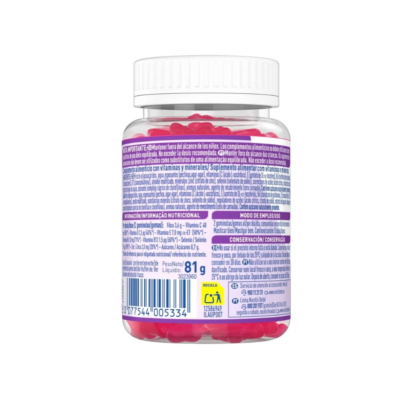 Fruto-oligossacarídeos, água, espessantes (pectina, ágar-ágar), vitaminas [C (ácido L-ascórbico), E (acetato de DL-α-tocoferilo), B6 (cloridrato de piridoxina), D (colecalciferol), B12 (cianocobalamina)], amido modificado, substâncias minerais (citrato de zinco, selenato de sódio)], reguladores de acidez (ácido cítrico, citrato de sódio), extrato de baga de sabugueiro, corante (complexos cúpricos de clorofilas e clorofilinas), aromas naturais, agente de revestimento (cera de carnaúba).