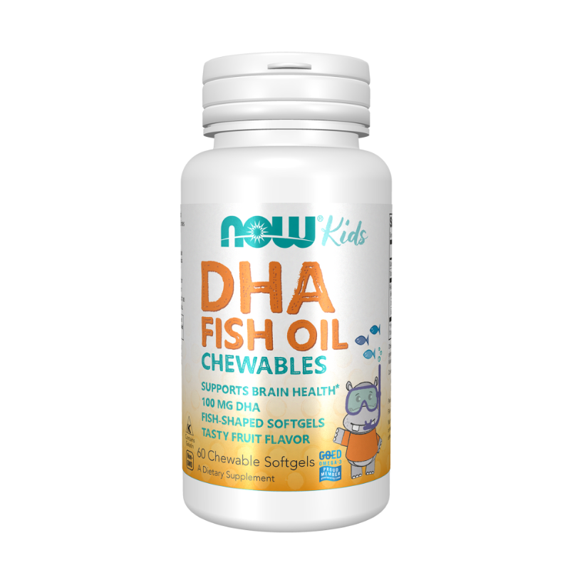NOW Kids DHA Óleo de Peixe 60 Comprimidos Mastigáveis: O ómega-3 que os miúdos adoram! Softgels em forma de peixe com sabor frutado delicioso. Cada dose fornece 100 mg de DHA para suporte à saúde cerebral e função cognitiva*. Óleo de peixe concentrado, testado para metais pesados e contaminantes. Para crianças a partir dos 4 anos.