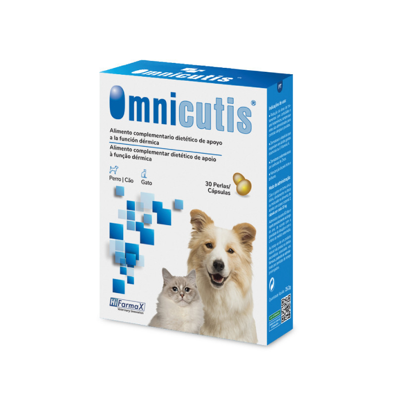 Omnicutis Cápsulas é um suplemento alimentar para cães e gatos, indicado em situações de doenças dermatológicas. Contém a mais alta concentração nos Ómega 3 de maior eficácia (EPA e DHA) e é fortemente suplementado com todos os nutrientes necessários à rápida recuperação de doenças dermatológicas.