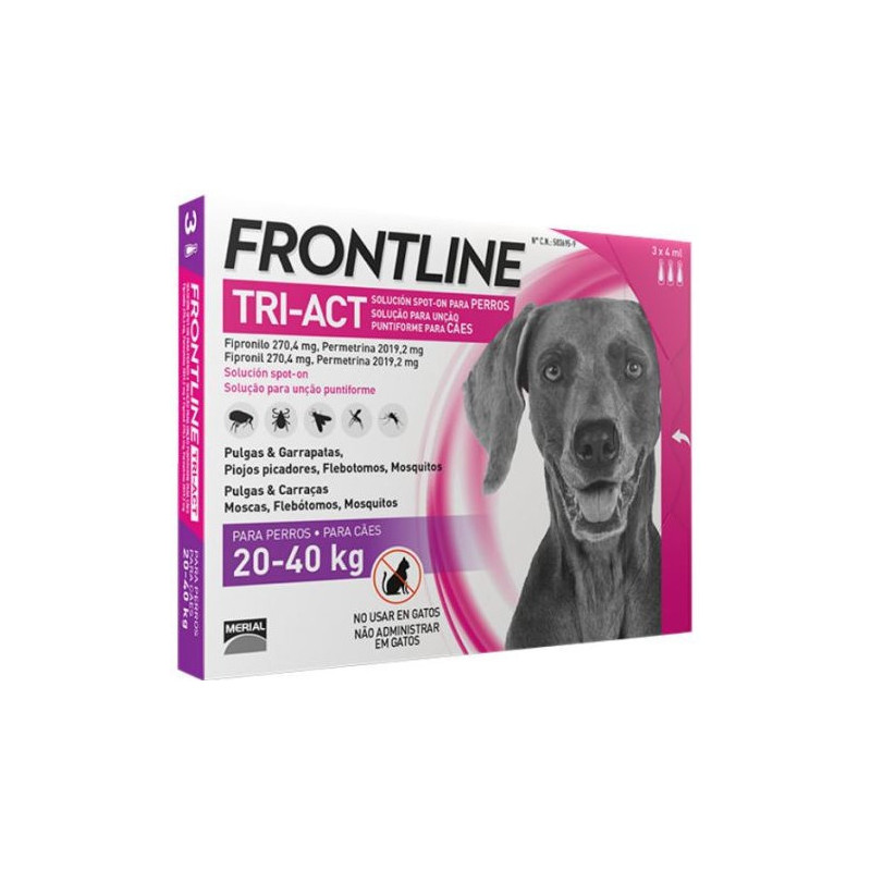 Frontline Tri-Act Solução Cão 40-60Kg Pipetas x3 é um desparasitante de largo espectro para cães com peso entre os 40 e os 60 quilos.