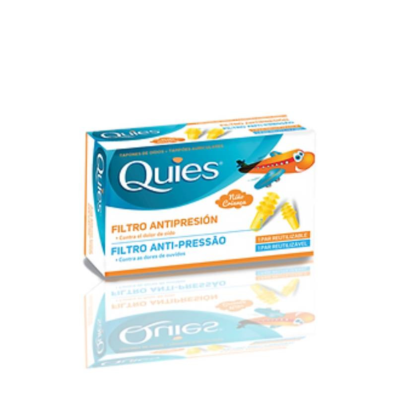 Quies Tampões Auriculares Voo Criança 1 Par previne o desconforto da descolagem e da aterragem e possui um filtro de cerâmica para adaptação às variações de pressão e prevenir a dor no tímpano.