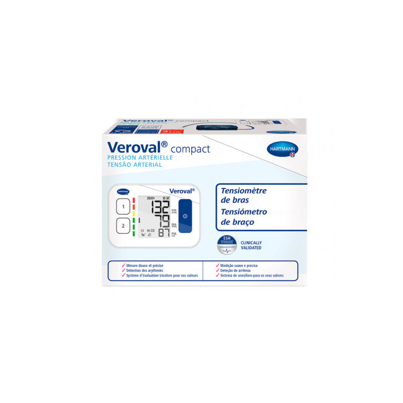 Veroval Compact Tensiómetro de Braço é um aparelho medidor que deteta e indica arritmias cardíacas e de fácil leitura. Ainda analisa de forma simples as medições com o sistema de semáforo. Inclui um estojo e 4 pilhas.