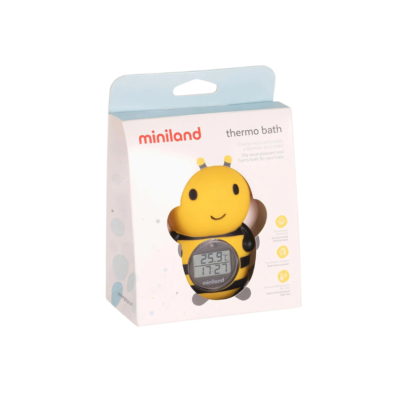 Termómetro de banho e ambiente Miniland com design de abelha. Mede a temperatura da água e do ar em 2 segundos. Alerta visual (luz verde/fria, vermelha/quente). Com cronómetro e temporizador. Seguro para o bebé brincar na água.