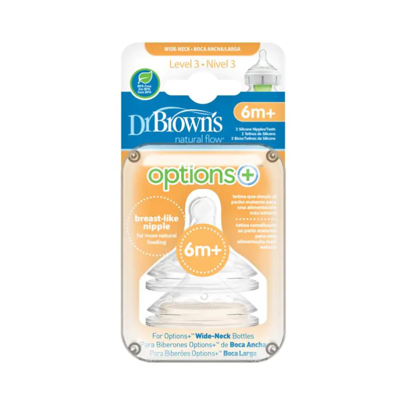 A Tetina Options+ Nível 3 de Boca Larga da Dr. Brown's foi concebida para responder às necessidades dos bebés a partir dos 6 meses, cuja sucção se torna mais forte e que necessitam de um fluxo de leite mais rápido. Mantendo o design que imita o peito materno, oferece a mesma aceitação natural e conforto, agora com um fluxo adaptado.