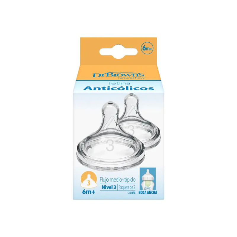 Tetina de silicone Dr. Brown's boca estreita nível 3 (fluxo rápido) para bebés +6 meses. Perfurada a laser para um fluxo preciso. Forma estreita e flexível. Livre de BPA. Qualidade médica.