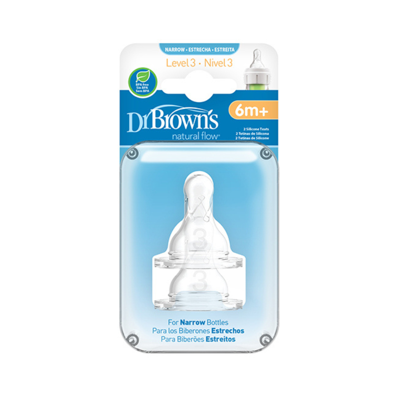 Tetina de silicone Dr. Brown's boca estreita nível 3 (fluxo rápido) para bebés +6 meses. Perfurada a laser para um fluxo preciso. Forma estreita e flexível. Livre de BPA. Qualidade médica.