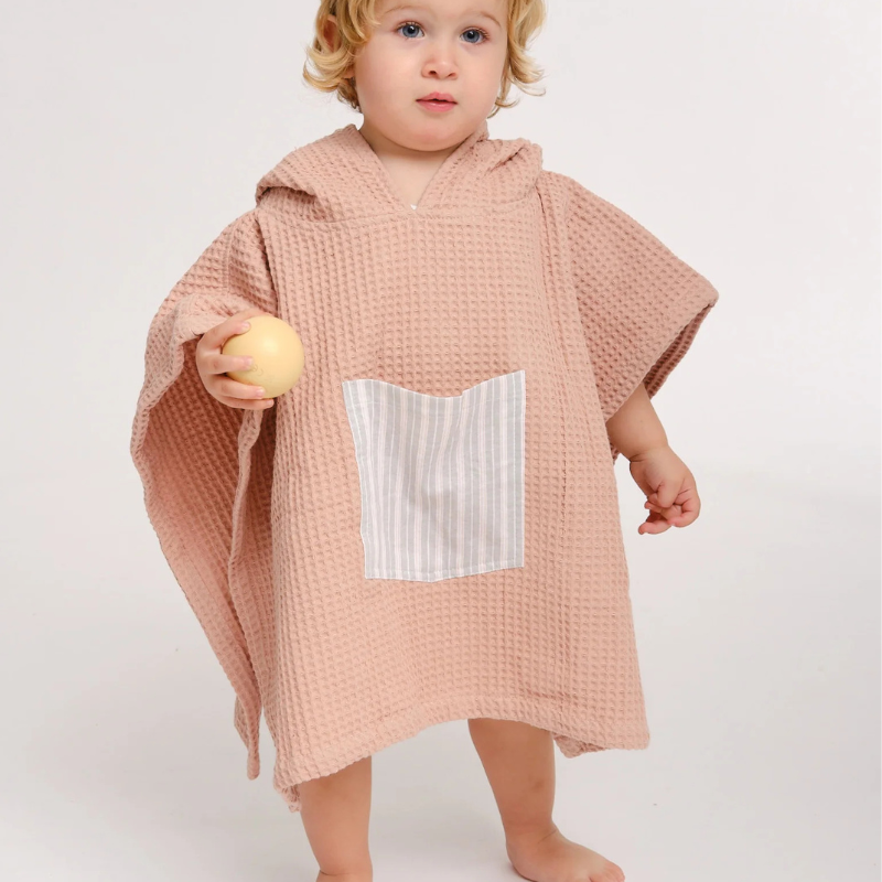 Feito em algodão 100% natural, é incrivelmente leve, macio e absorvente. O seu capuz integrado é a funcionalidade-chave: permite enrolar e proteger a cabeça e os ombros da criança logo após sair da água, ajudando a manter a temperatura corporal e a proteger do sol e do vento enquanto se seca ou brinca na areia. É a transição perfeita da água para a terra.