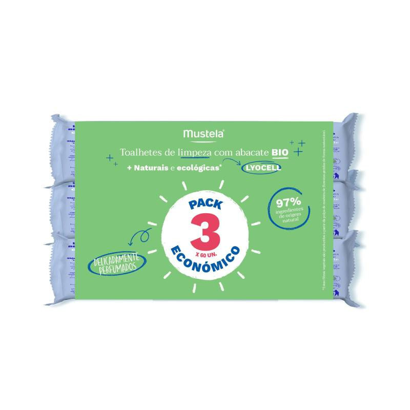 Mustela Bebé Toalhitas de Limpeza Abacate Pack Económico 3x60 é um pack promocional composto por 3 embalagens de 60 unidades.